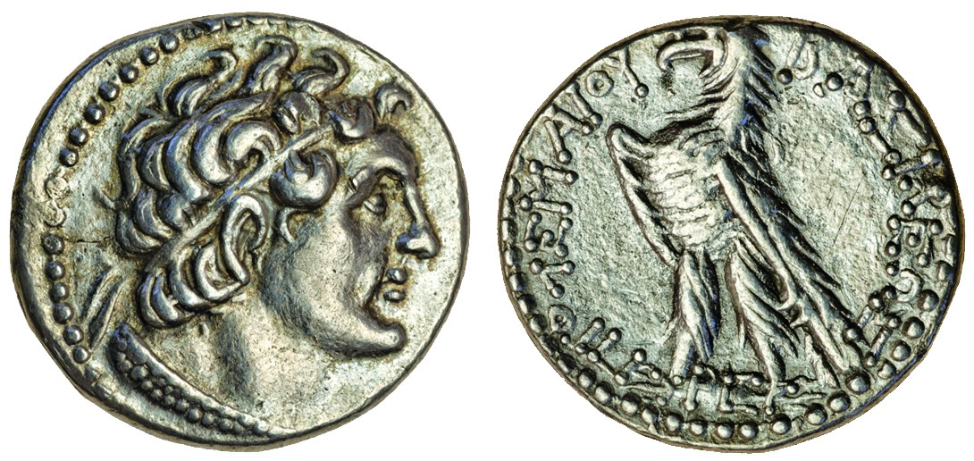 Kingdom of Egypt, Ptolemy VI (180-145 BC), AR Didrachm, 6.94g, Arados, 154/153 BC, diademed head of Ptolemy I right, aegis round neck, rev. eagle standing left on thunderbolt, date (year 106) on thunderbolt (SNG Copenhagen 553), good very fine