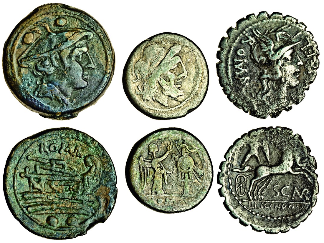 Roman Republic, M. Aurelius Scaurus, AR Denarius, 3.62g (Cr.282/1), Victoriatus, 2.86g, anonymous type, fine, Sextans, head of Mercury right, rev. prow right (Cr.41/9), about very fine (3)