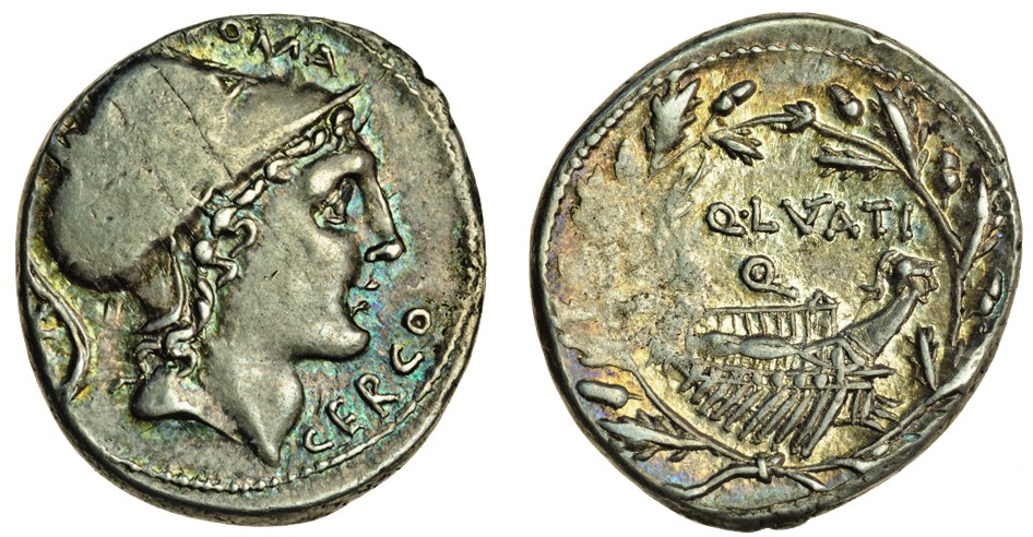Q. Lutatius Cerco (109-108 BC), Denarius, 3.90g, Rome, head of Roma right, wearing helmet ornamented with stars and a feather, monogram behind, cerco before, rev. q. lvtati q above galley, right, within oak-wreath (Cr.305/1; Syd.559), helmet detail weak, weak patch on reverse, toned, good very fine