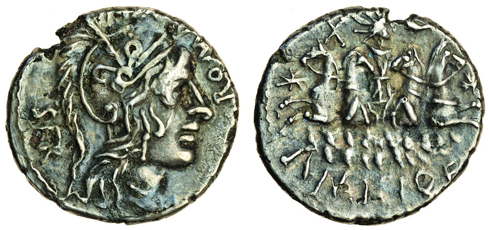 A. Manlius Sergianus (118-107 BC), Denarius, 2.51g, helmeted head of Roma right, rev. Sol in facing quadriga rising from sea waves, star either side, crescent moon and x above (Cr.309/1; Syd.543), toned, rare, very fine