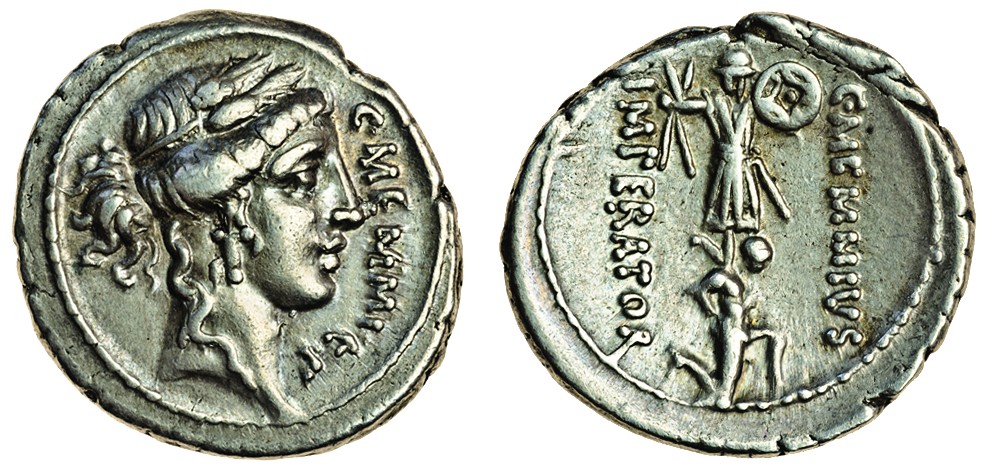 C. Memmius (c.56 BC), Denarius, 3.72g, head of Ceres right, wreathed with corn, c. memmi c.f, rev. c. memmivs imperator, captive kneeling right before trophy of Eastern arms (Cr.427/1; Syd.920), about extremely fine