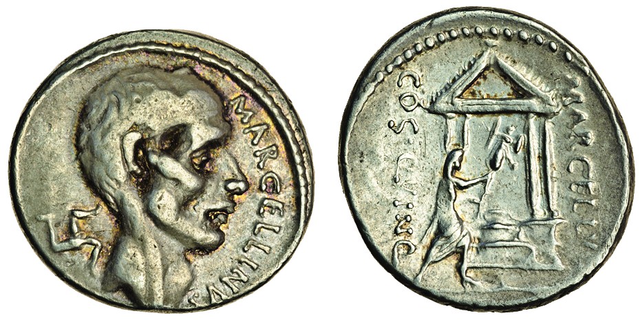 P. Cornelius Lentulus Marcellinus (c.50 BC), Denarius, 3.92g, bare head of M. Claudius Marcellus (consul 222 BC) right, triskeles behind, marcellinvs, rev. M. Claudius Marcellus, togate, carrying trophy into tetrastyle temple of Jupiter Feretrius, marcellvs cos qvinc (Cr.439/1; Syd.1147),  good very fine