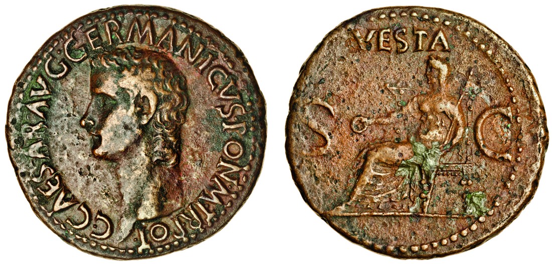 Caligula (AD 37-41), As, bare head left, rev. vesta s-c, Vesta seated left, holding patera and sceptre (BMC 46; RIC 38), green-brown tone, very fine