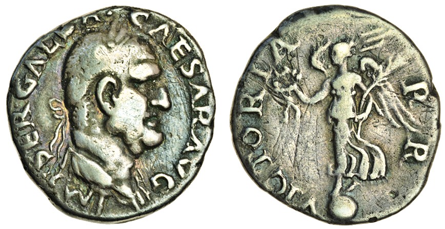 Galba (AD 68-69), Denarius, 3.23g, laureate, draped head right, rev. victoria p r, Victory standing left on globe, holding wreath and palm-branch (RIC 217; C.328), toned, marks in field to left of Victory, good fine