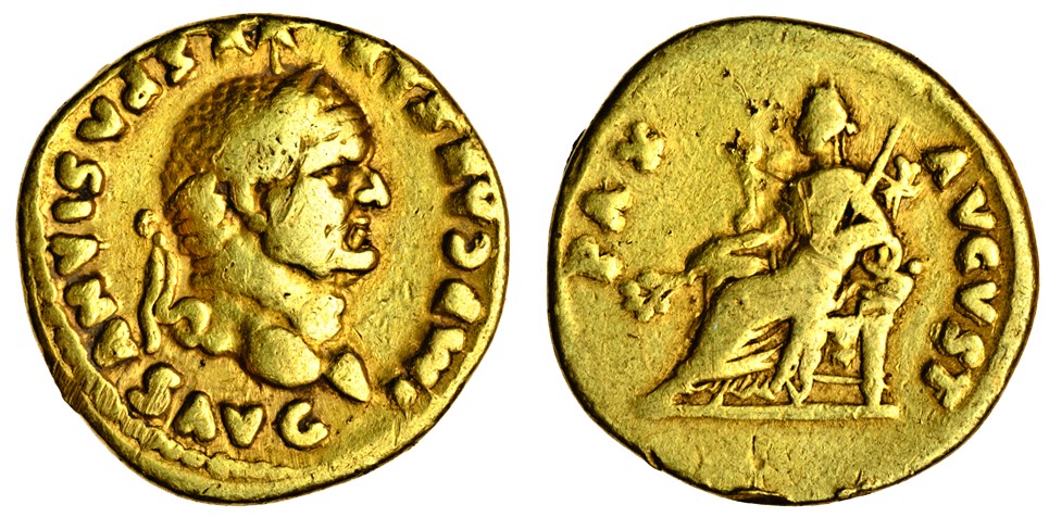 Vespasian (AD 69-79), AV Aureus, 6.97g, Rome, AD 75, laureate head right, imp caesar vespasianvs avg, rev. pax avgvst, Pax seated left, holding branch and sceptre (BMC 280; RIC 770), good fine