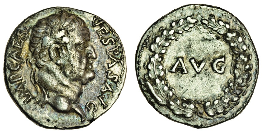 Vespasian (AD 69-79), Denarius, 3.22g, Ephesus, AD 69/70, laureate head right, rev. avg within laurel-wreath (RIC 1392; C.36), excellent portrait in high relief, good very fine