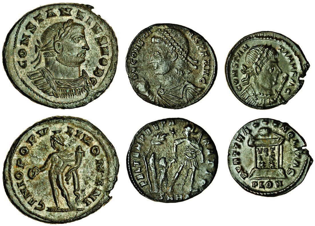 Constantius I (as Caesar, 293-305), Follis, London, 303-05, laureate cuirassed bust right, rev. genius standing left holding patera (RIC 37a), traces of silvering, extremely fine, Constantine I, AE3, London, laureate cuirassed bust right with sceptre, rev. beat tranqvlitas, altar inscribed vot / is / xx, in ex. plon (RIC 267), very fine, Constans, AE1, rev. soldier with captive under tree, fine (3)