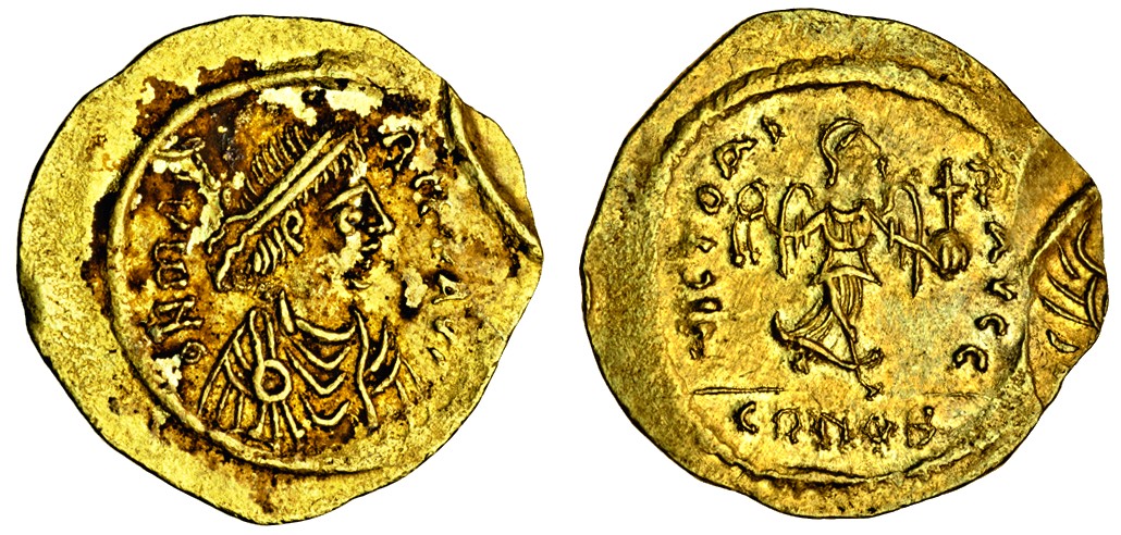Maurice Tiberius (582-602), AV Semissis, 2.26g, diademed, draped and cuirassed bust right, rev. victori avgg, Victory moving right, holding wreath and cross on globe (Sear 487; DOC 11), removable brown deposit on obverse, small part of another strike at edges, very fine