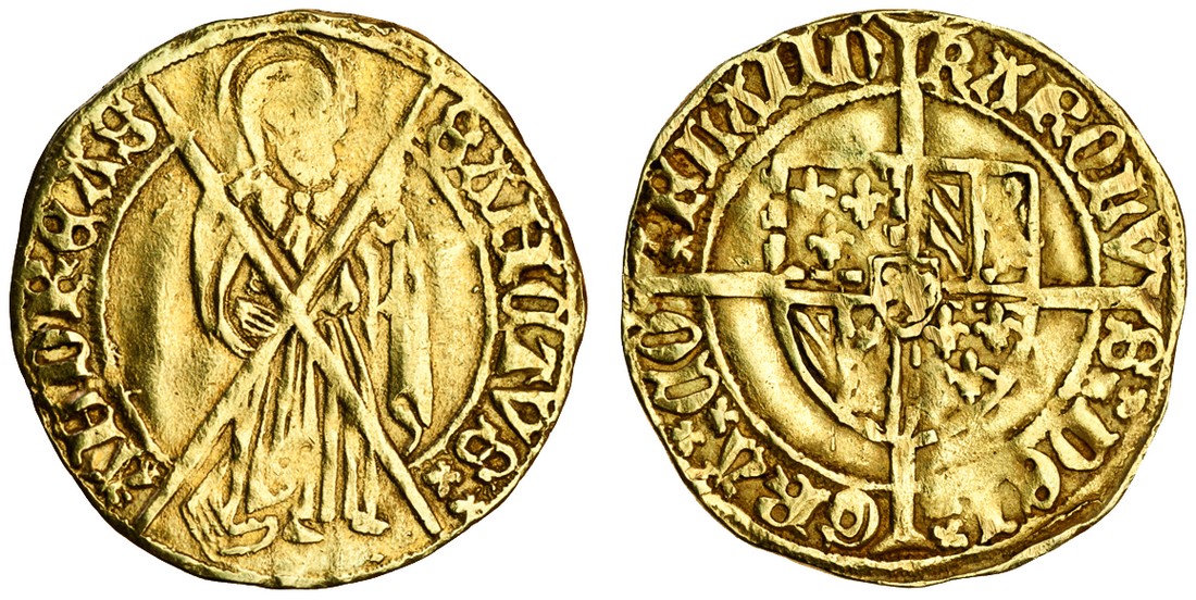 Belgium, Flanders, Charles le Téméraire (1467-1477), Florin d'or de Bourgogne, 3.33g, undated, Bruges, St Andrew standing, head right, rev. karolvs: dei: gra: co: fland, shield (Del.493; F.189), scrape in centre of reverse, probably from a mount, fine