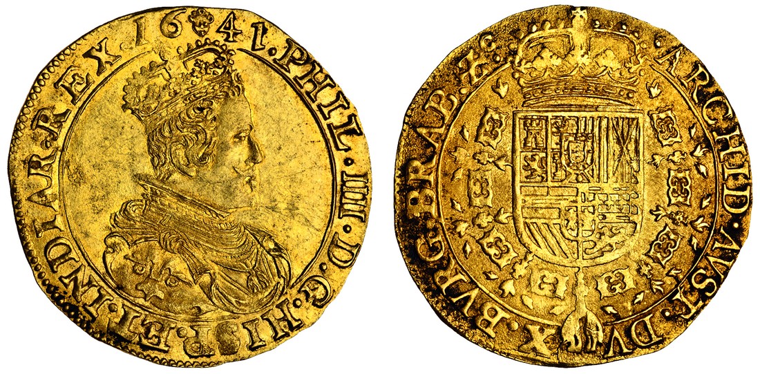 Belgium, Brabant, Philip IV (1621-65), Brussels, Double Souverain d'or, 11.09g, 1641, crowned, cuirassed bust right, rev. crowned shield in Collar of the Golden Fleece (F.106), an old 'find' with deposit still on reverse, very fine