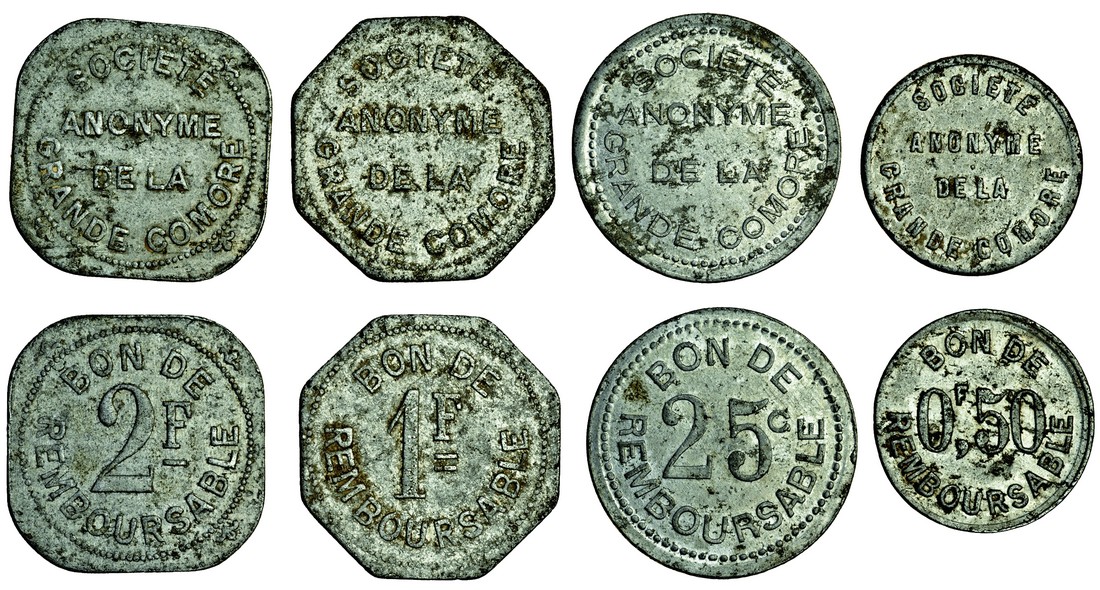 Comoros, French Colonial, Token coinage (1915), aluminium Franc, 50-Centimes, 25-Centimes (KM Tn4, 4, 2, 1; Pick Tn.1-4), very fine rare as a set (4)