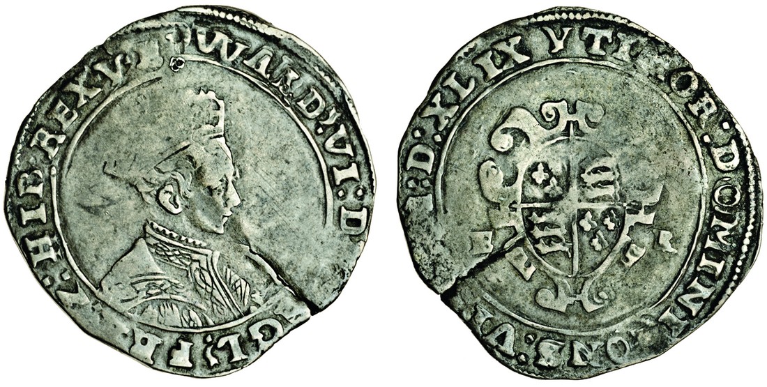 Edward VI, second period, Jan. 1549-Apr. 1550, Shilling, 5.20g, Southwark, mdxlix, m.m. y, crowned bust right, rev. garnished shield dividing e r (N.1917/2; S.2466B), flan crack, attempted piercing above bust, good fine