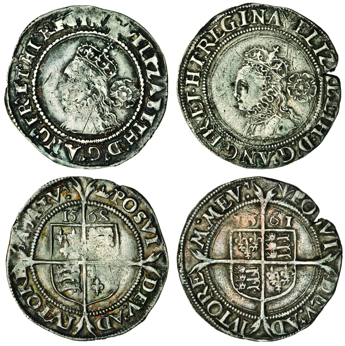 Elizabeth I, third and fourth issues, 1561-77, Sixpences (2), 2.99g, 1561, m.m. pheon, crowned bust left, rev. shield over long cross fourchée (N.1997; S.2560), edge split, nearly very fine, 2.95g, 1568, m.m. coronet, rev. inverted 8 in date (N.1997; S.2562), fine / good fine (2)