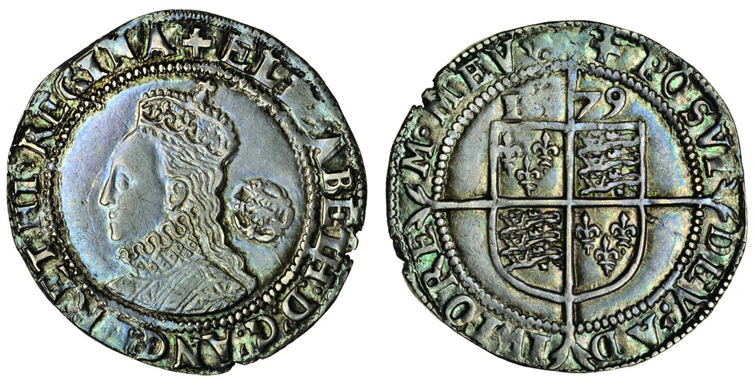 Elizabeth I, fifth issue, 1577-82, Sixpence, 3.20g, 1579, m.m. Greek cross, crowned bust left, rev. shield over long cross fourchée (N.1997; S.2572), good detail of bust, almost very fine