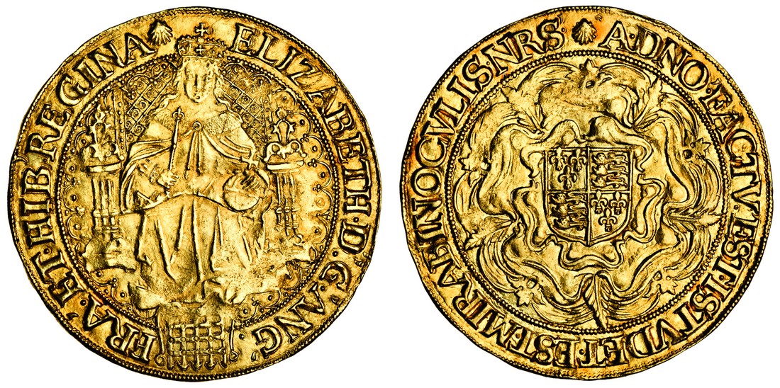 Elizabeth I, sixth issue, 1583-1600, Sovereign, 15.33g, m.m. escallop, queen, crowned, seated facing holding sceptre and orb, portcullis at feet, back of throne with pellet within annulet decoration and pellets on pillars, pellet stops, rev. shield over double rose, pellet stops (Schneider 781- same reverse die, different obverse die; N.2003; S.2529), slightly weak on face, attractive, very fine, rare