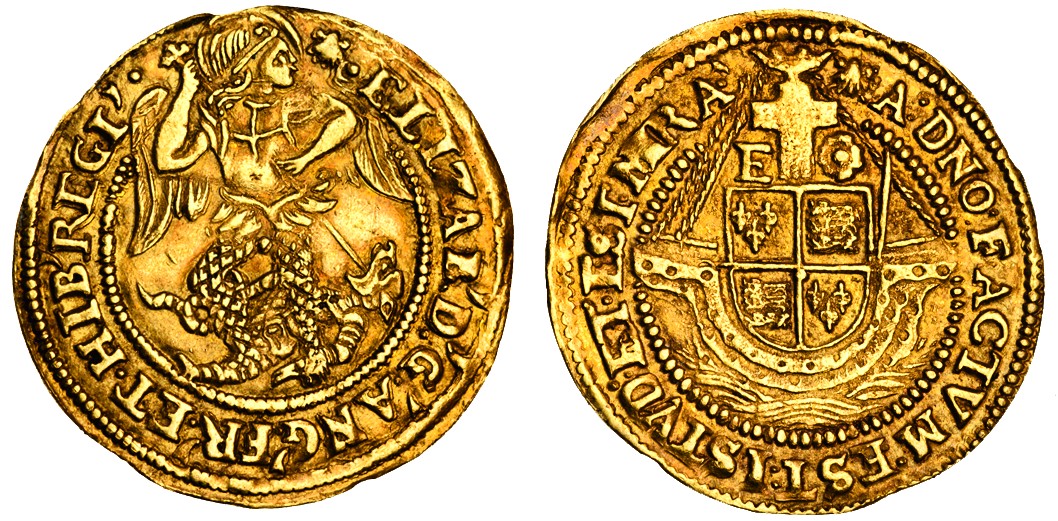 Elizabeth I, sixth issue, 1583-1600, Half-Angel, 2.46g, m.m. escallop, St Michael spearing dragon, hib regi, rev. shield within ship, cross above dividing e and a rose (cf Schneider 791-92, this m.m. not represented in Schneider; N.2006; S.2532), good detail of St Michael, good very fine, rare