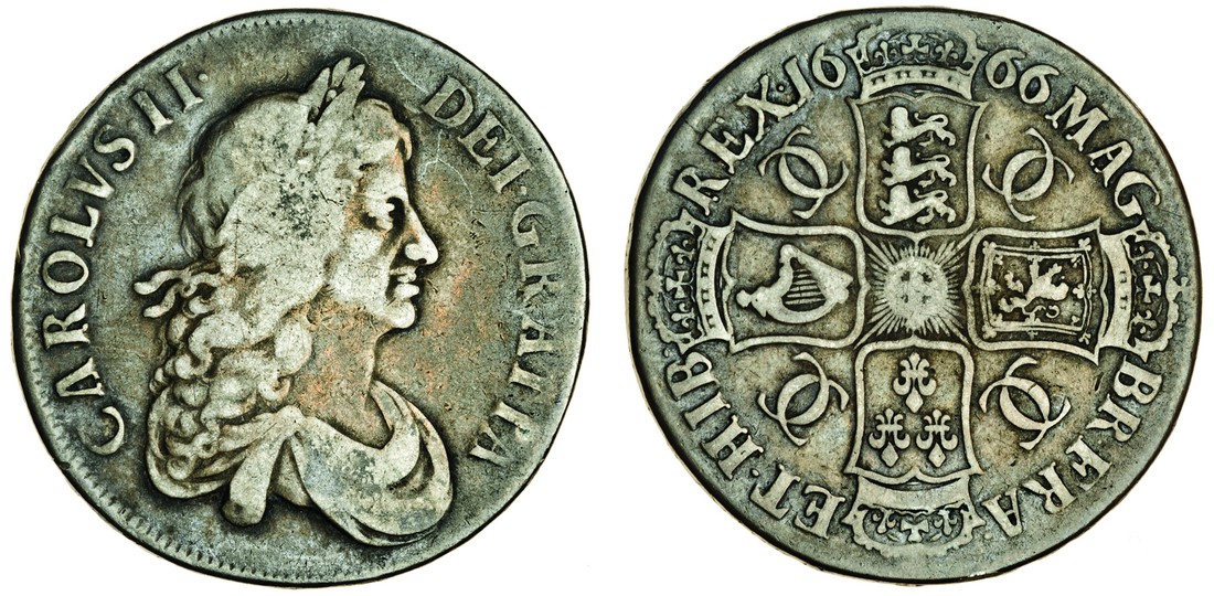 Charles II, Crown, 1666 xviii, second laureate, draped bust right, rev. four crowned shields cruciform, interlinked cs in angles (ESC 32; S.3355), fair / fine