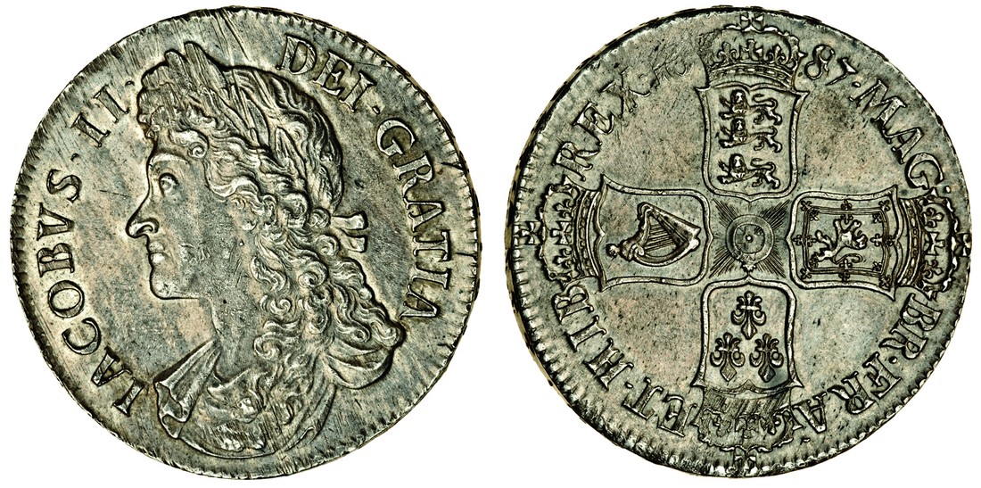 (x) James II, Crown, 1687 tertio, second laureate, draped bust left, rev. four crowned shields cruciform (ESC 78; S.3407), mark on cheek, obverse adjustment marks, even grey tone, extremely fine