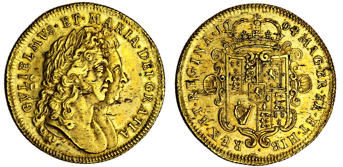 (x) William and Mary, Two-Guineas, 1694 over 3, laureate, conjoined heads right, rev. crowned garnished shield (MCE 146; S.3424), haymarks, marks on busts, lustrous, good very fine