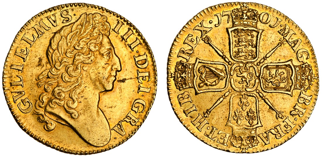 William III (1694-1702), Guinea, 1701, second laureate, head right, rev. four crowned shields cruciform (MCE 186; S.34630, light scuff by French shield, traces of lustre, good very fine