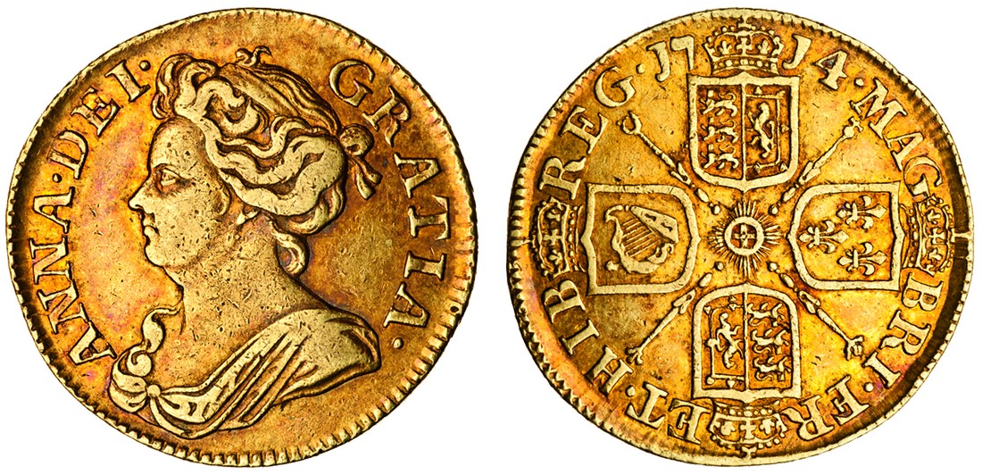 Anne, post-Union, Guinea, 1714, third, draped bust left, rev. four crowned shields cruciform (MCE.226; S.3574), very fine, toned