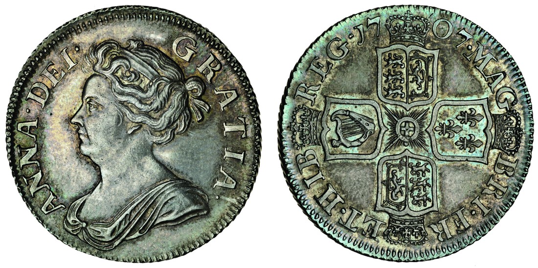 Anne, post-Union, Shilling, 1707, third draped bust left, rev. four crowned shields cruciform (ESC 1141; S.3610), lustrous, toned, extremely fine