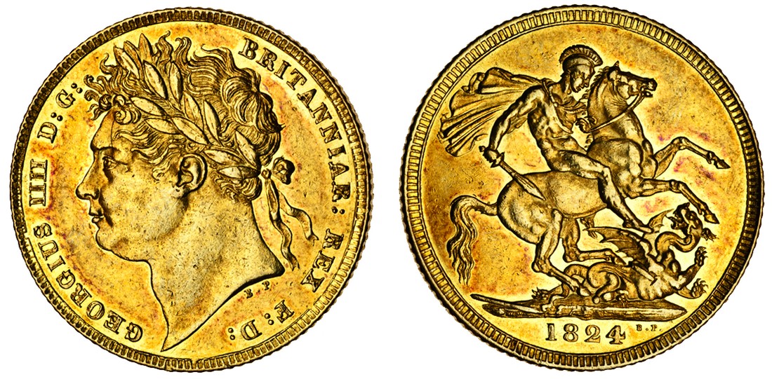 (g) George IV, Sovereign, 1824, laureate head left, rev. St George and dragon (Marsh 8; S.3800), nearly extremely fine