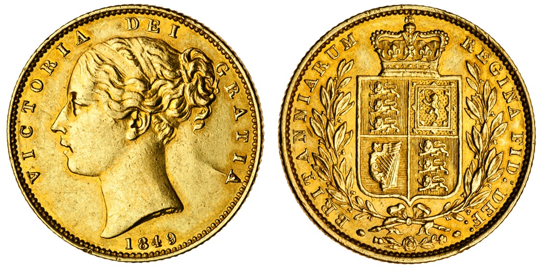 (g) Victoria, Sovereign, 1849, young head left, rev. crowned shield within wreath (Marsh 32; S.3852C), very fine