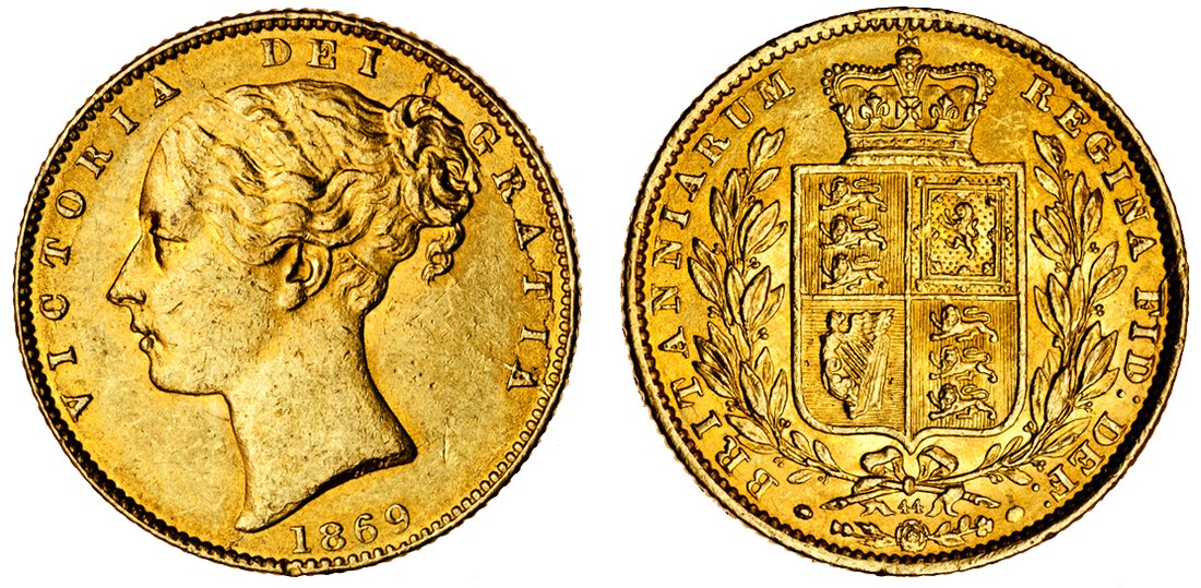(g) Victoria, Sovereign, 1869, young head left, rev. crowned shield within wreath, die 44 (Marsh 53; S.3853), good very fine