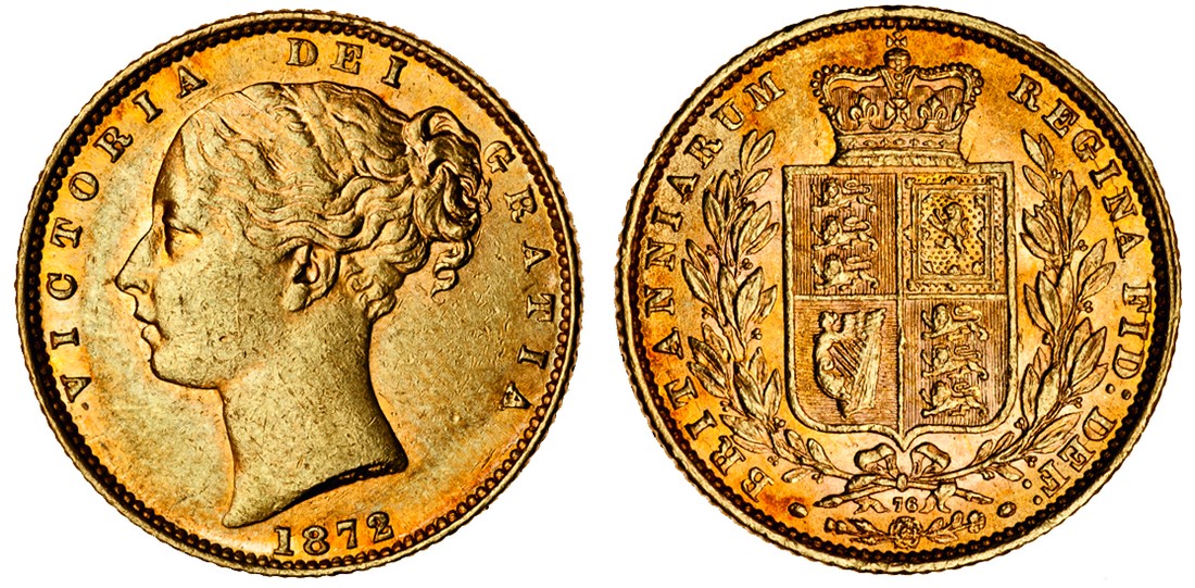 (g) Victoria, Sovereign, 1872, young head left, rev. crowned shield within wreath, die 76 (Marsh 56; S.3853B), very fine