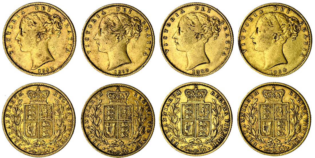 (g) Victoria (1837-1901), young head Sovereigns (4), 1849, 1850, 1858, 1864 die 100, rev. crowned shield within wreath (Marsh 32, 33, 41, 49; S.3852C, 3852D, 3853), generally fine (4)