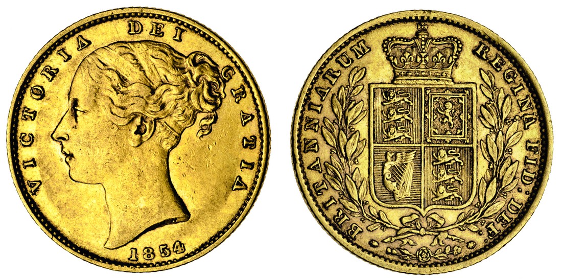 (g) Victoria, young head Sovereign, 1854, rev. crowned shield within wreath (Marsh 37; S.3852C), almost very fine