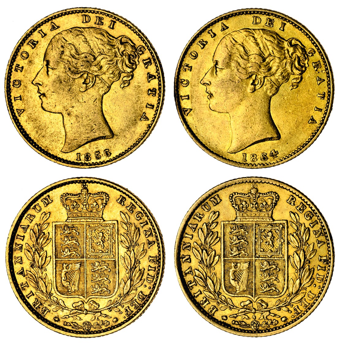 (g) Victoria, young head Sovereigns (2), 1856, rev. crowned shield within wreath (Marsh 35; S.3852D), good very fine, 1864, die 4 (Marsh 49; S.3853), nearly very fine (2)