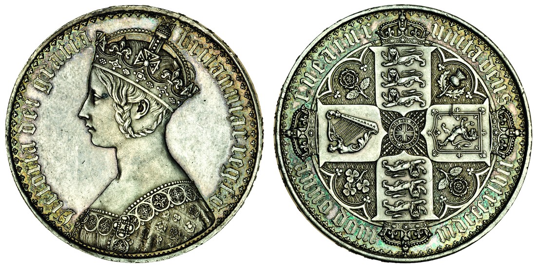 Victoria, 'gothic' Crown, 1847 undecimo, crowned bust left, rev. four crowned shields cruciform, emblems in angles (ESC 288; S.3883), small stain by eye, extremely fine