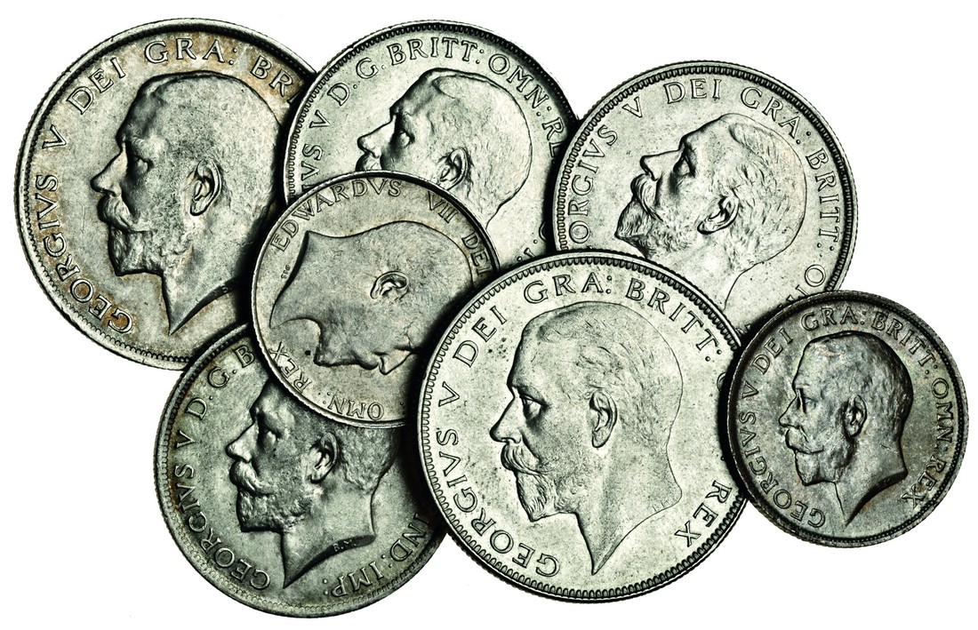 Edward VII, Shilling, 1910 (S.3982), extremely fine, George V (6), Halfcrowns (2), 1914, 1936 (S.4011, 4037), extremely fine, Florins (3), 1916, 1918, 1928 (S.4012, 4038), one good very fine, the others extremely fine, Shilling, 1911 (S.4013), extremely fine (7)
