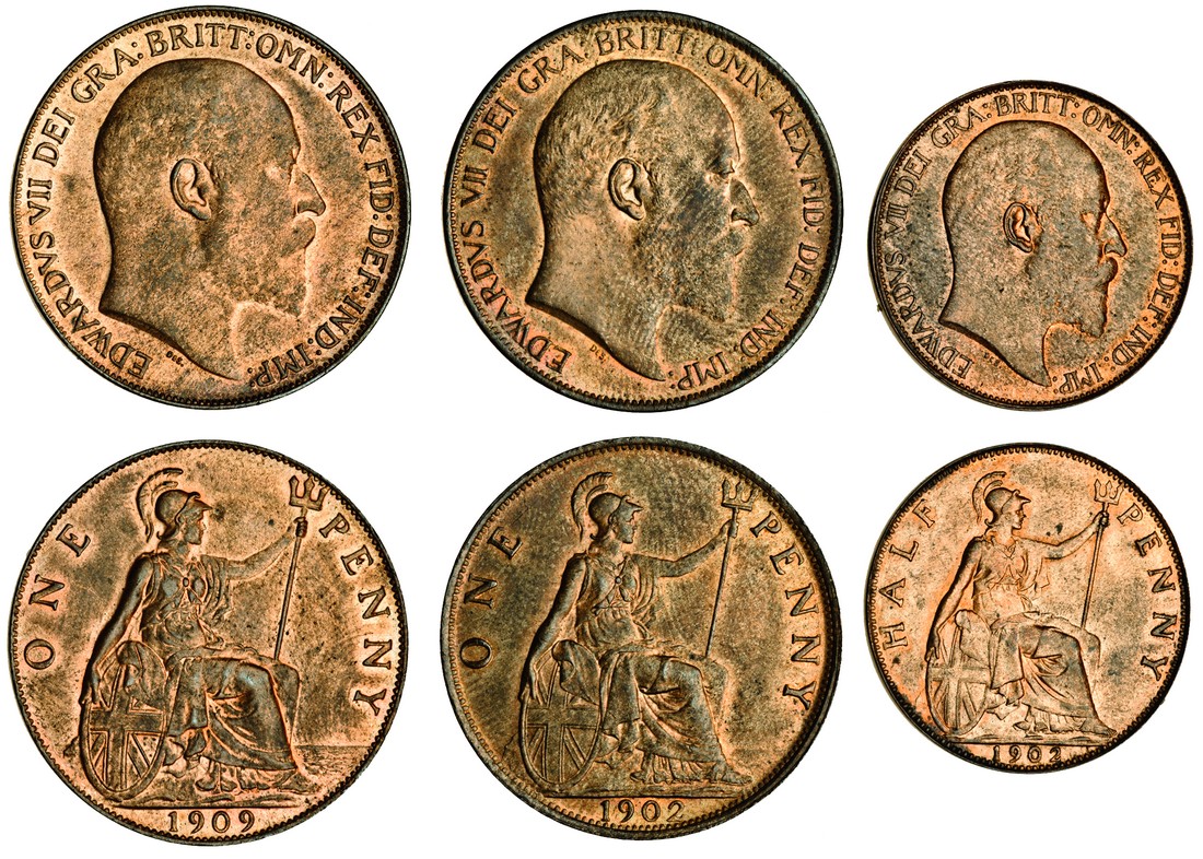 Edward VII, Pennies (2), 1902 'low tide,' head right, rev. Britannia (S.3990A), finger mark, extensive lustre, almost uncirculated, 1909 (S.3990), extensive lustre, good extremely fine, Halfpenny, 1902 'low tide' (S.3991A), extensive lustre, extremely fine (3)