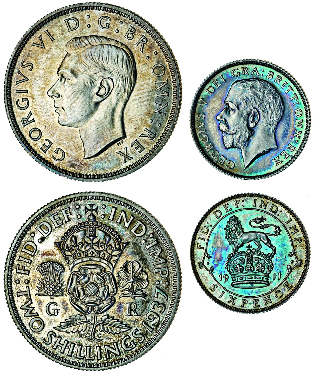 George V, proof Sixpence 1911, head left, rev. lion on crown (ESC 1796; S.4014), steel blue tone, as struck, George VI, proof Florin, 1937, head left, rev. crowned rose (ESc 957; S.4080), as struck (2)