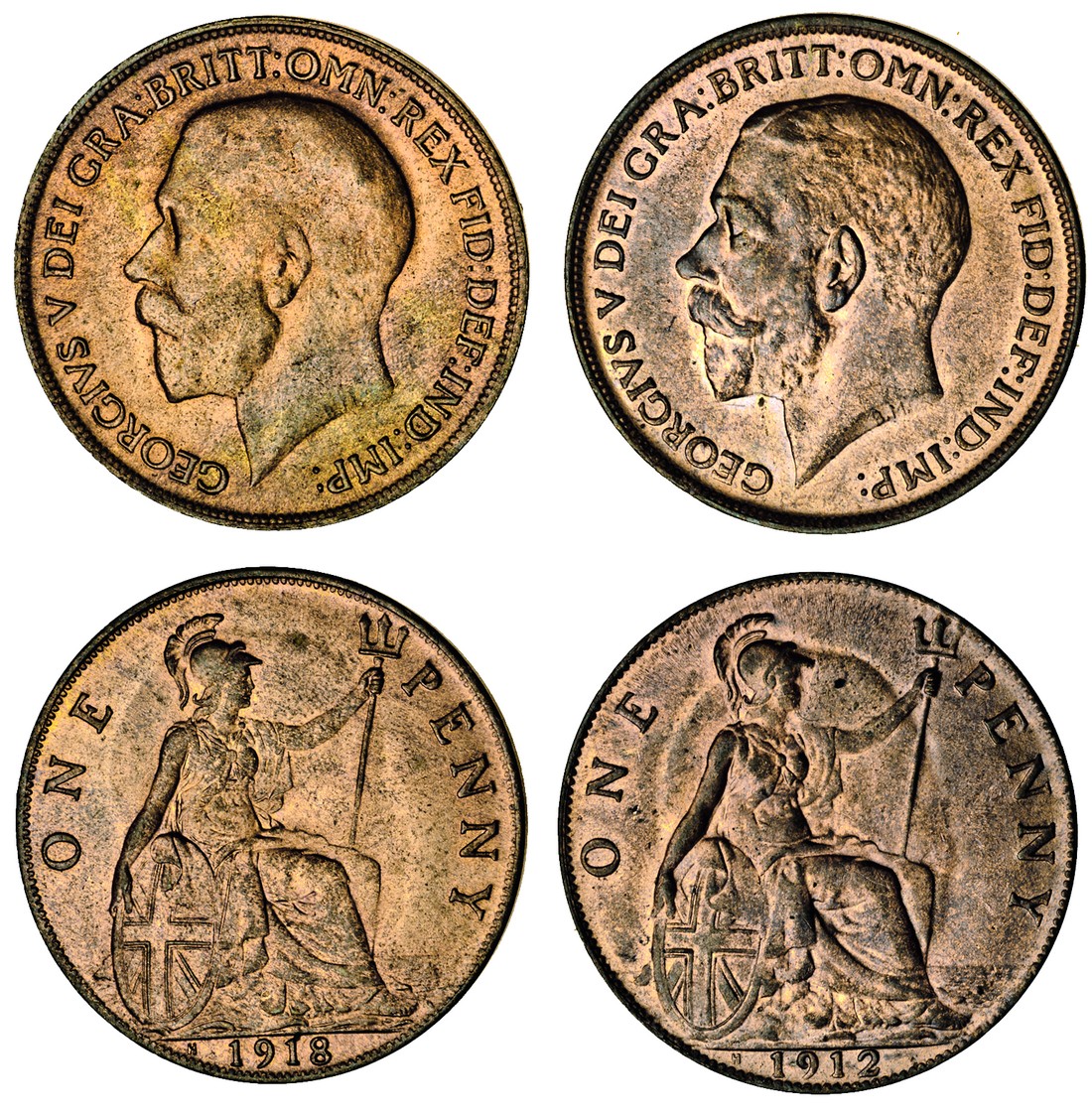 George V, Pennies (2), 1912H, 1918H, head left, rev. Britannia (S.4052), the 1912 weakly struck in places on reverse, the 1918 weak on obverse, lustrous, extremely fine (2)
