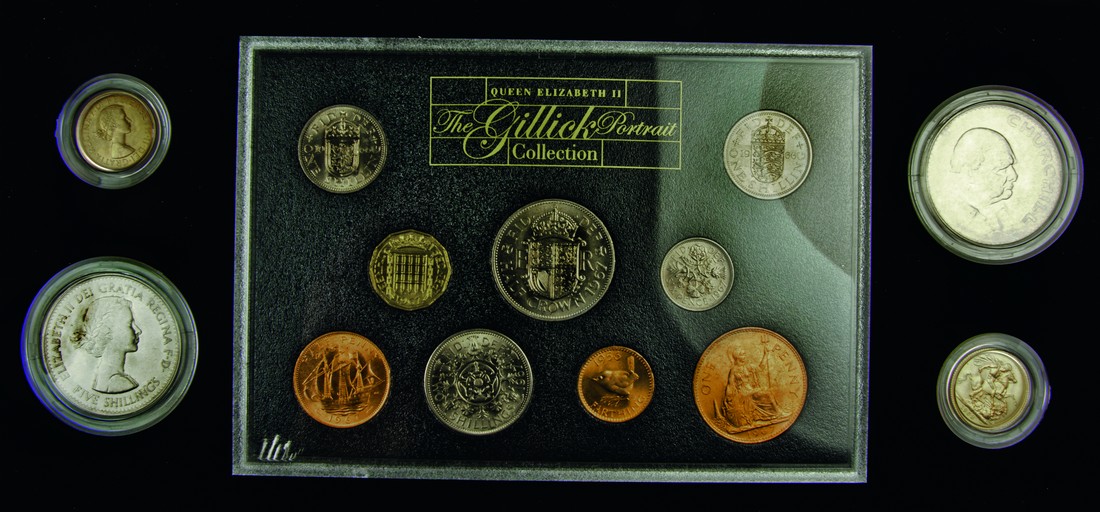(g) Elizabeth II, The Gillick Portrait Collection, 1956-1968, containing Sovereigns (2), 1957, 1968, and one example of all currency coins bearing Gillick portraits, and 'Behind Enemy Lines' Gulf War collection, containing Sovereign, 1980, and miniature replicas of the Gulf Medal and the Kuwait Liberation Medal, extremely fine, in Royal Mint presentation cases (13)