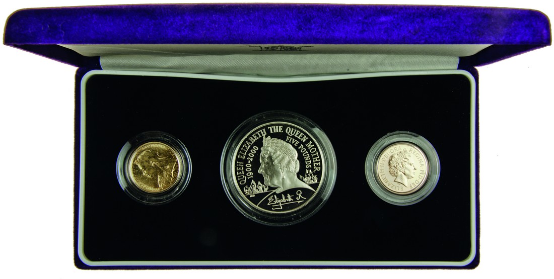 (g) Elizabeth II, Royal Birthday Collection 1900-2000, containing Victoria, Sovereign, 1900 M, fine, Elizabeth II, proof Sovereign, 2000, proof Crown, 2000, the proofs brilliant mint state, in Royal Mint case of issue, 2,000 sets issued (3)