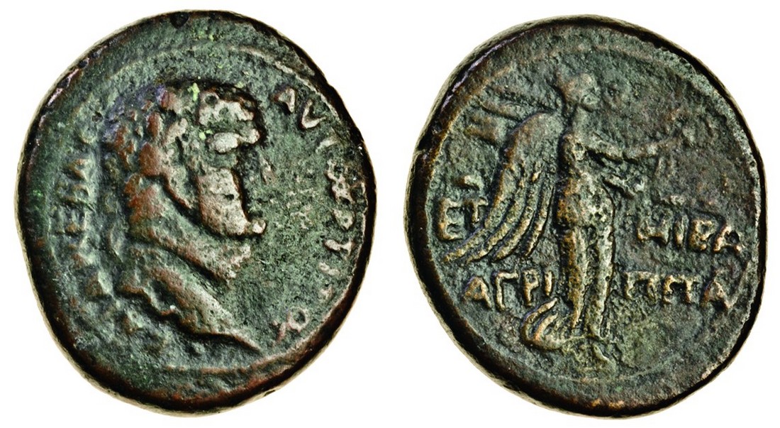 Herodians, Agrippa II (55-95 CE), AE 25mm, year 18 = 77/8 CE, laureate bust of Titus right, rev. Nike standing right, holding wreath and palm branch, et-hi ba/api-a in field (Hendin 596; AJC 15), well centred, good fine
