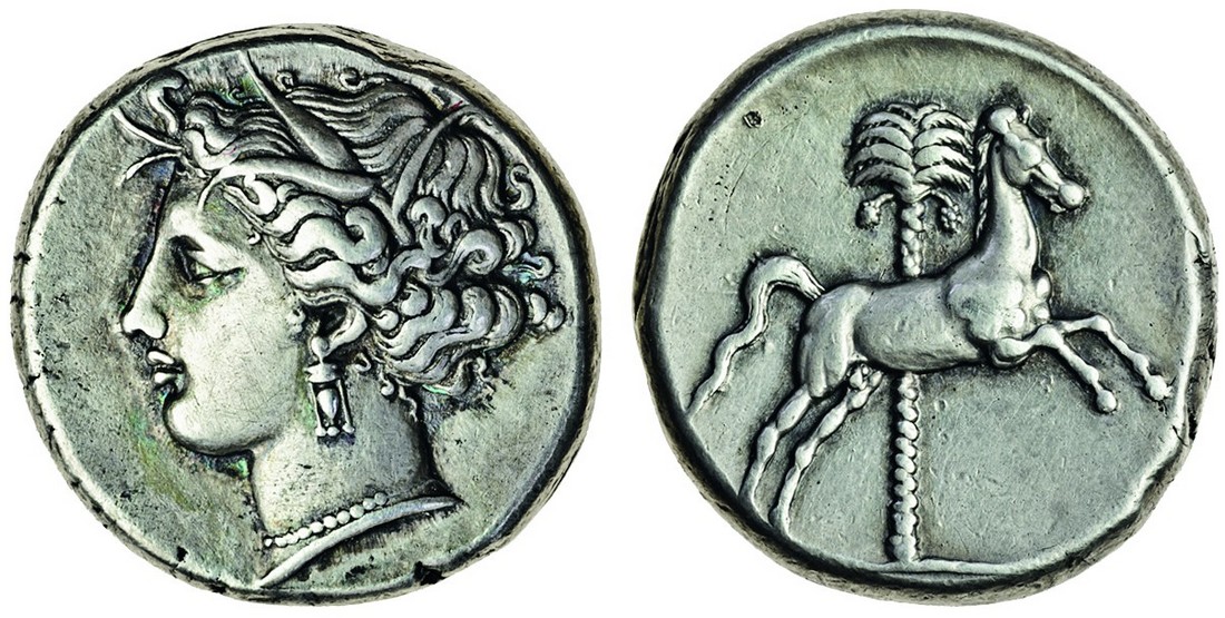 The Carthaginians in Sicily (c.330-320 BC), AR Tetradrachm, 17.03g, uncertain mint, head of Tanit-Persephone left, wreathed with corn, rev. horse prancing right past palm-tree behind (Jenkins 126; SNG Lockett 1037), irridescent tone developing, almost extremely fine
