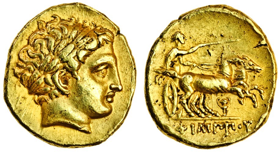 Kingdom of Macedon, Philip II (359-336 BC), AV Stater, 8.62g, Pella, c.323-315 BC, laureate head of Apollo right, rev. ioy in ex., charioteer driving biga right, amphora below (SNG ANS 172-176), light scratch behind head of Apollo, very minor traces of mounting on edge, broad flan, good very fine