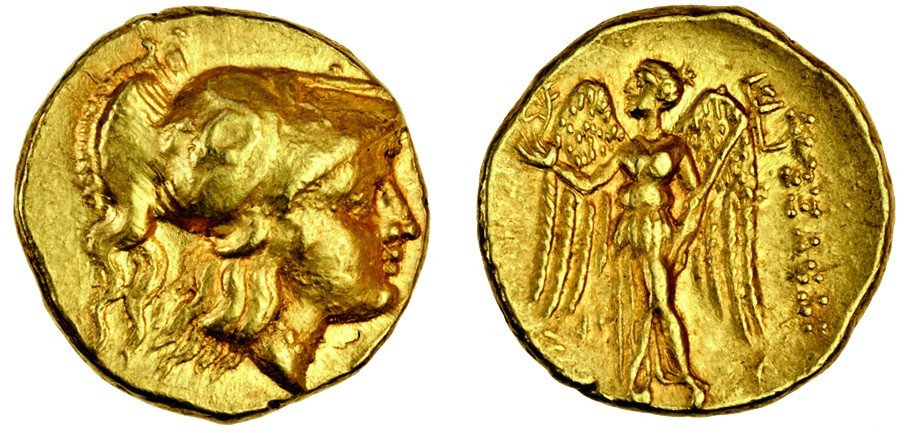 Kingdom of Macedon, Alexander III, the Great (336-323 BC), AV Stater, 8.54g, Sidon, helmeted head of Athena right, rev. aeanoy, Nike standing left holding wreath and stylis, symbol below left wing (Price 3505A), very fine