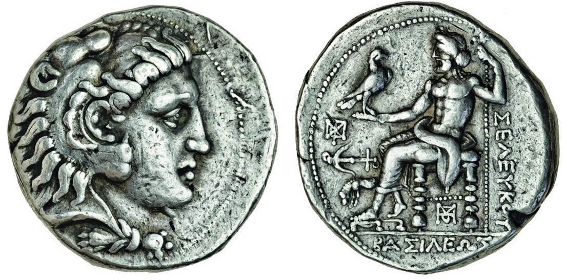 Kingdom of Syria, Seleukos I, Nikator (312-280 BC), AR Tetradrachm, 17.11g, Ecbatana, head of young Herakles right, wearing lion's skin, rev. baie eykoy, Zeus enthroned left, holding eagle and sceptre, on left, horse grazing, Seleucid anchor and monogram, another monogram under throne (Newell, ESM, 487; SNG Israel 169), very fine