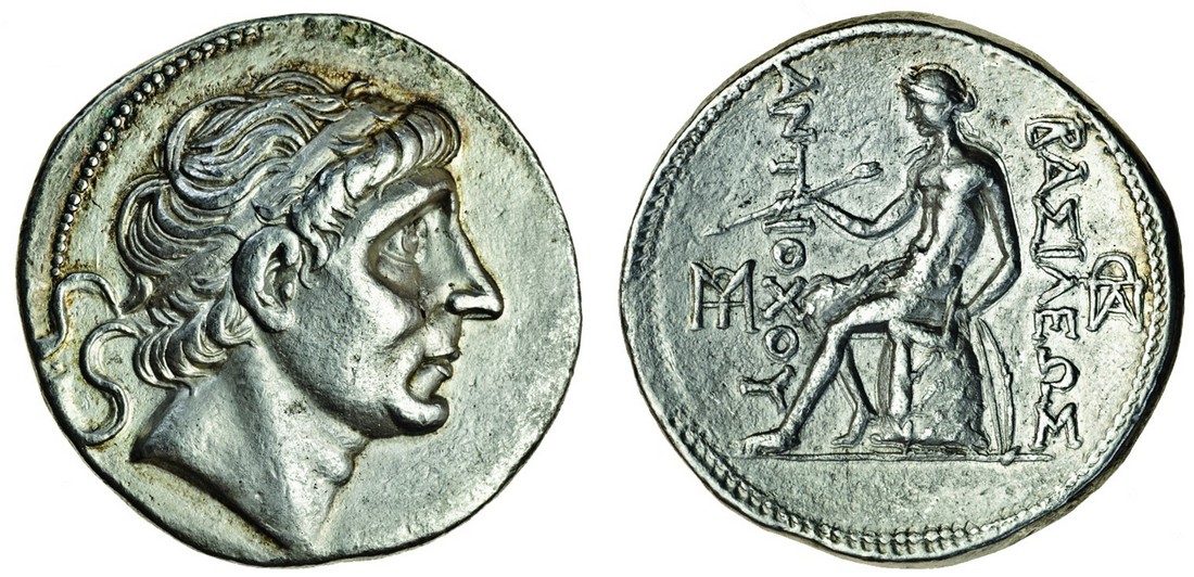 Kingdom of Syria, Antiochos II, Theos (261-246 BC), AR Tetradrachm, 16.65g, Seleucia, diademed head right, rev. baie antioxou, Apollo seated left on omphalos, holding arrow and bow, monograms on left and right (Seleucid Coins 587.1; Newell, ESM, 180), almost extremely fine