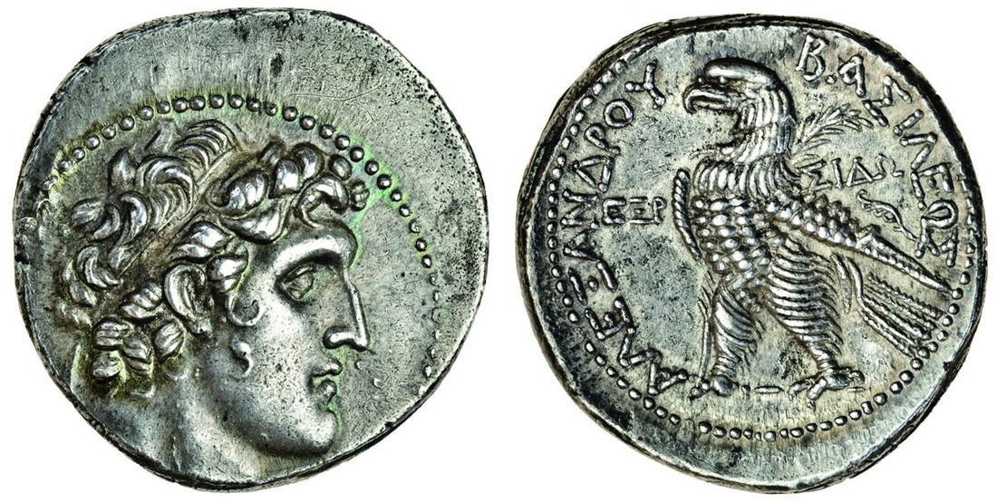Kingdom of Syria, Alexander I, "Balas" (150-145 BC), AR Tetradrachm, 14.03g, Sidon, 148/7 BC, diademed head right, rev. baie aeanpoy, eagle standing left, palm branch behind, Seleucid date ep (year 165) on left, i on right (SNG Israel 1517; Seleucid Coins 1830.4), toned, extremely fine
