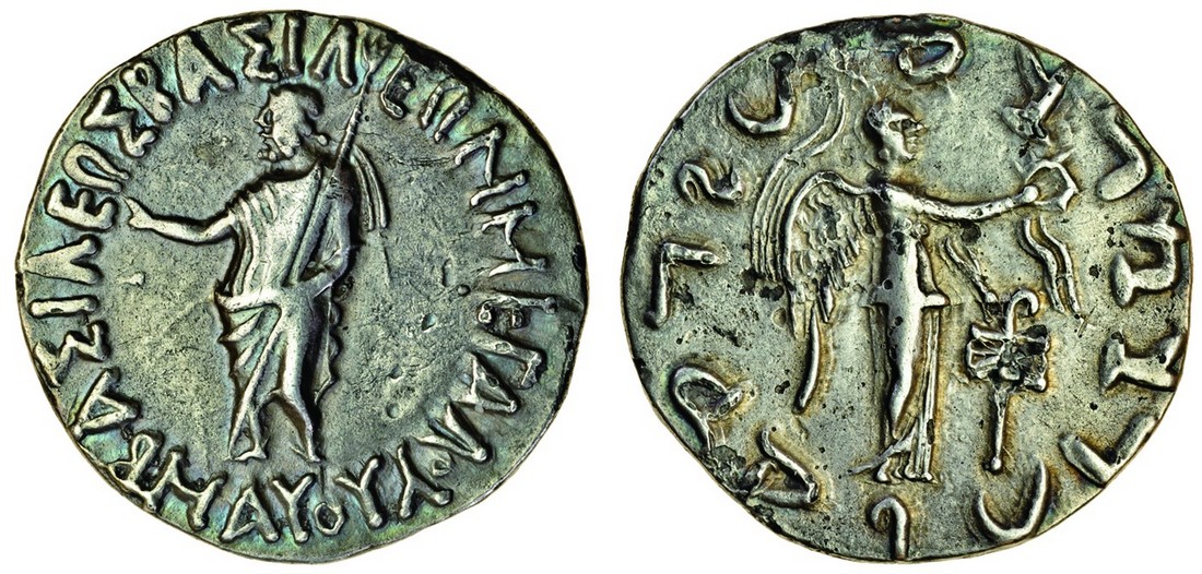 Indo-Scythian, Maues (c.90-60 BC.), Taxila, AR Tetradrachm, 9.43g, Zeus standing left wearing himation, carrying 3-pronged sceptre with arm extended left, baie baien meaoy mayoy, rev. winged Nike standing right, palm with streamers over shoulder, right arm extended holding wreath, monogram below right, Kharosthi legend around: Rajadirajasa Mahatasa Moasa (Senior 1.1T; M.729), some reverse imperfections, about very fine