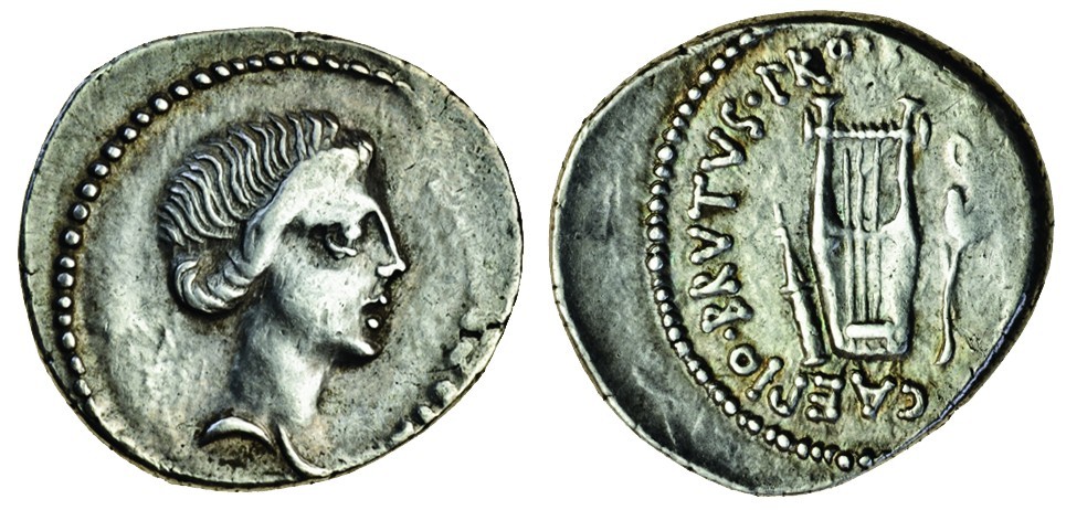Q. Caepio Brutus, AR Denarius, 3.68g, Lycia, 43-42 BC, head of Libertas right, rev. lyre between quiver and filleted laurel-branch (RRC 501/1; Junia 34; Sear, Imperators, 199), reverse a little off-centre, toned, very fine, scarce