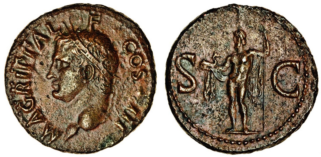 Caligula (AD 37-41), issues in honour of Agrippa, AE As, Rome, AD 37-41, head of Agrippa left wearing rostral crown, rev. s-c, Neptune standing holding dolphin and trident (RIC 58), well-centred bold bust, a little weakly struck on the reverse, extremely fine